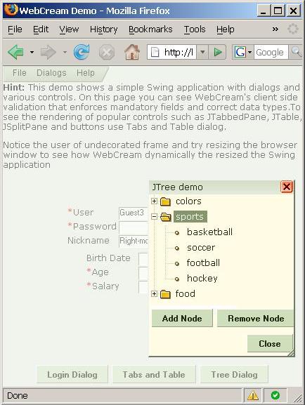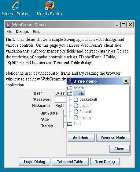 new and improved site. WebCream automatically converts Java Swing and AWT applications into fully-functional HTML and AJAX websites. WebCream can be thought of as a runtime Java to HTML converter that migrates Java graphical user interface to a browser-based front end. It then emulates user actions as GUI events for the Swing application to ensure that the business logic executes correctly. WebCream is unique in that it requires no modifications to existing applications, and does not require programmers to learn any APIs other then AWT/Swing. The same application can be run as thick Swing client or as a browser-based AJAX rich client. This allows companies to leverage the time and money invested into building Swing applications, while enjoying the benefits of thin-client deployment. For a full list of features see the Features page. Our product has been used by numerous clients since year 2000 and most of them have been able to convert the applications in less then a week. Conversion is a simple matter of installing WebCream and creating a configuration file for the application. Naturally, not all applications are well-suited for browser-based model, especially those with a lot of custom components. WebCream is ideally suited for form-based applications that fit into the request-response approach Continuing improvements to modern browsers and the emergence of Rich Internet Applications (RIA) has elevated the user experience with the web-based user interface to that of the thick client. Today the functionality of web applications easily matches and at times exceeds that of Java applications developed using Swing. Even though there is no standard and no dominant platform for developing RIA the choice is clear – the web is not getting built on Swing. Overwhelming majority of the web sites are built using AJAX, a combination of HTML, JavaScript and asynchronous XML requests. WebCream provides a natural migration path for Swing applications by providing automatic conversion to AJAX. Our product supports every standard Swing component by providing an AJAX version that runs in the browser.